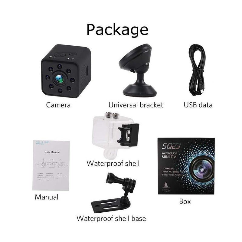 Package content | 1 * camera SQ23 - 1 * support set - 1 * charger cable - 1 * manual |