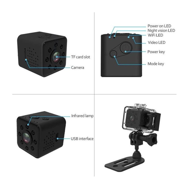Mini action camera Quelima SQ23 for recording video and photo in 1080p 30fps. Perfectly suited for extreme outdoor activities. AVI video format and recording on micro SD card. WIFI function and night vision.