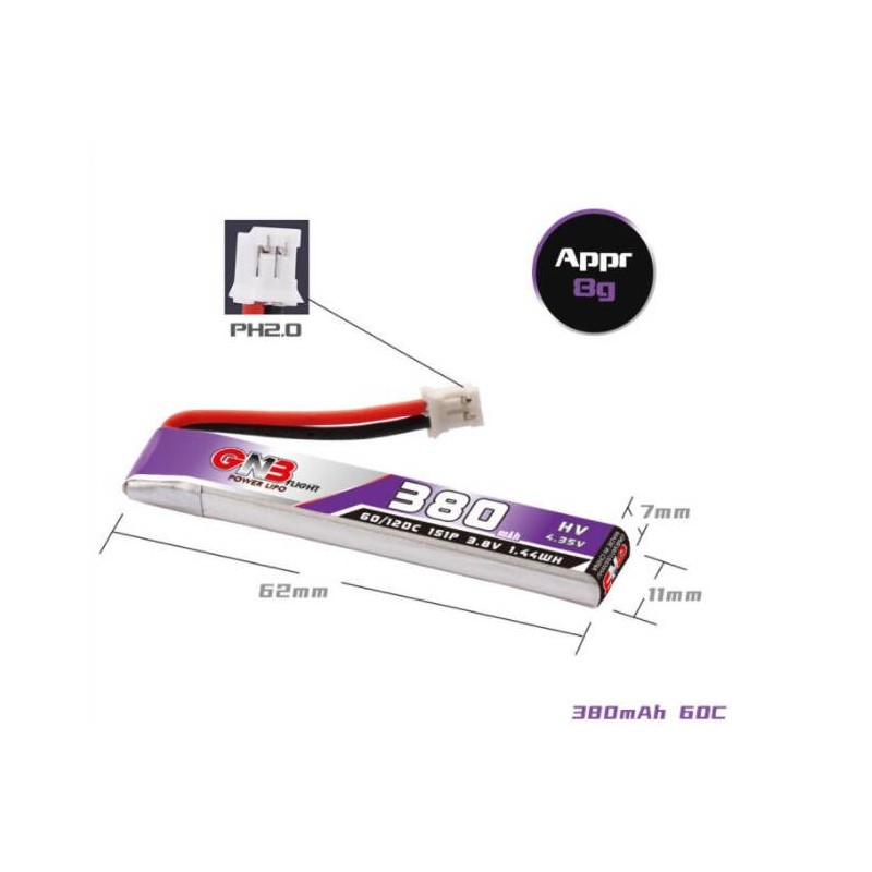 GNB Mini format battery for mini drone and tiny whoop. With silicon cable and JST PH 2.0 connector. Perfectly suited to a 65mm tiny whoop for a good mix of agility, range and performance.