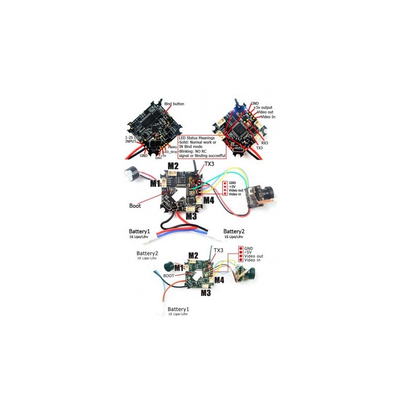 Flight controller F3 2S for tiny whoop. With a configurable OSD for Betaflight and an integrated receiver (flysky or frsky FCC). Works with two 1S batteries by plugging into two PH 2.0 or 2S sockets directly by adding an XT30 or other connection cable for 2S.