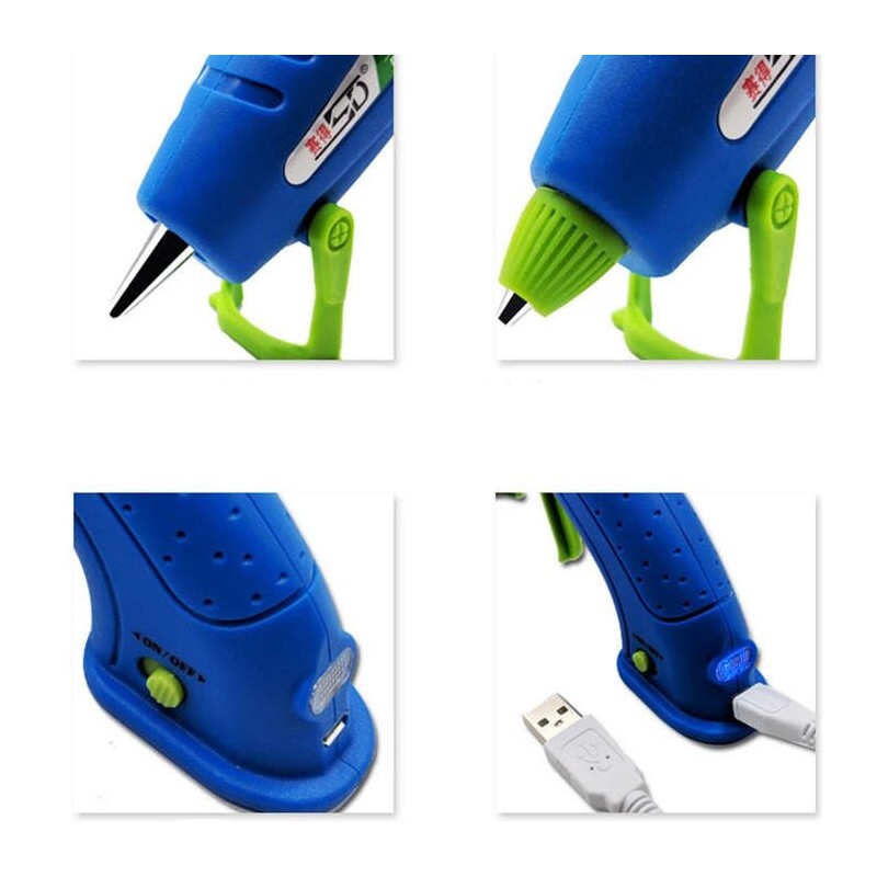 Hot glue gun with built-in 3.7V rechargeable battery. Light and small, this gun is very practical for gluing outdoors or in places without a power source.