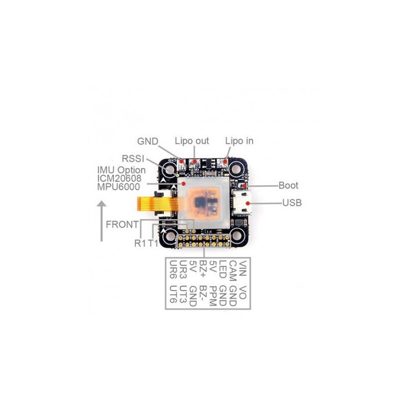 F4 flight controller nano of 5.7g for Betaflight. 20*20 mounting hole for mini frame racing. Integrated barometer to be configured with Betaflight. For Battery 2S to 4S.