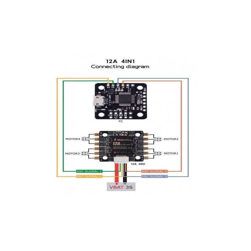 Makerfire 4 in 1 12a electronic speed controller for drone racing kit DIY. Input voltage for 2-3S battery and 20*20mm mounting hole.