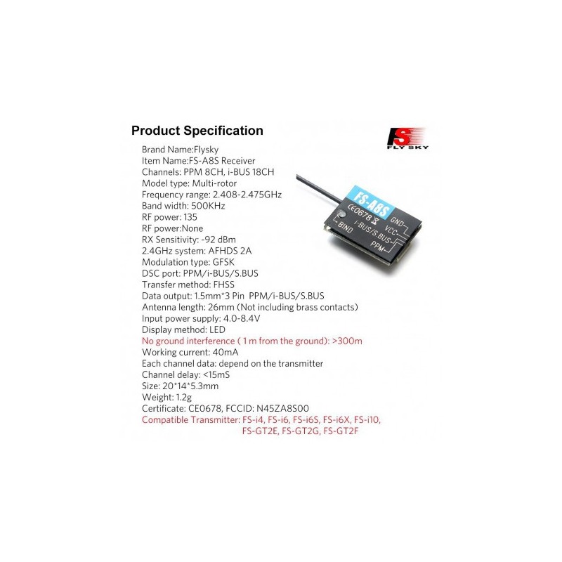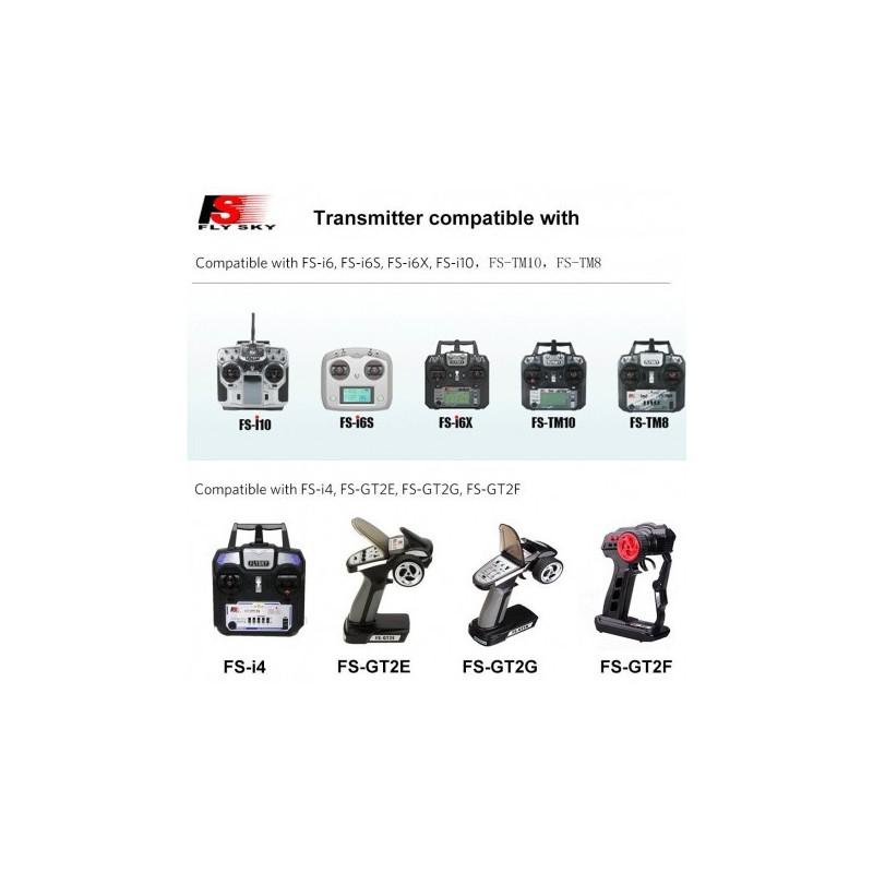 | Package content | 1 * Flysky FS-A8S - 1 * Câbles de branchement |