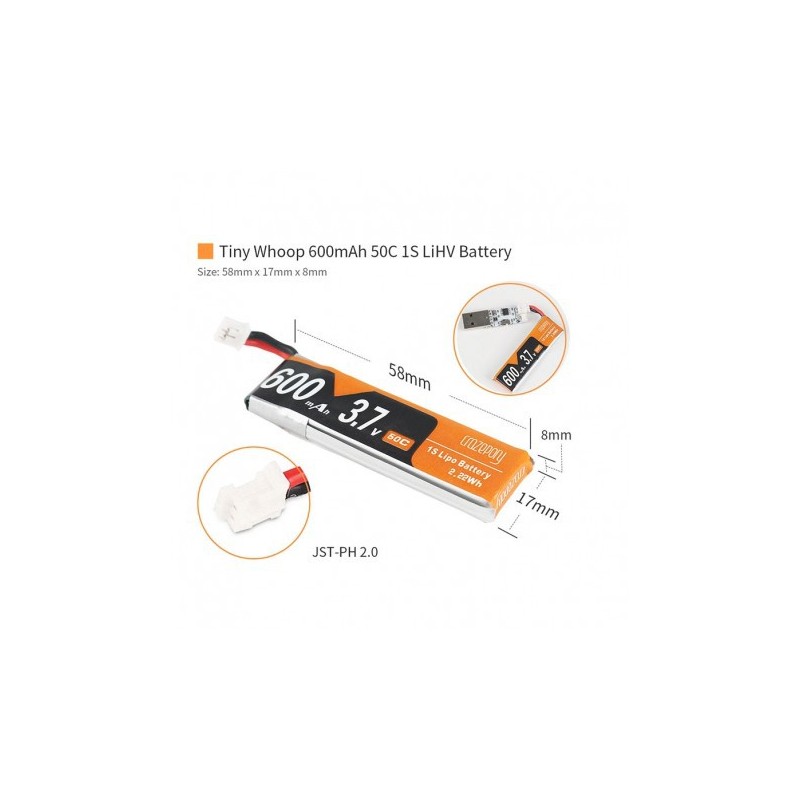 Batterie 1S 600mah pour mini drone 1S avec prise JST PH 2.0. Au format idéal pour un tiny whoop 1S et lui procurera une bonne autonomie grâce au 600mAh.