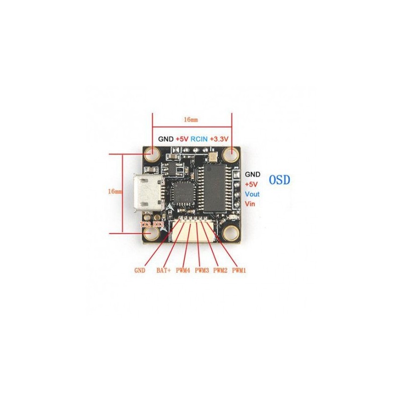 Mini Flytower avec contrôleur de vol F3 betaflight_3.1.7_OMNIBUS et ESC 6A 1S BLHELI_S par défaut en Dshot600. Trou de montage 16mm pour frame 60-88mm et OSD Betaflight intégré au contrôleur de vol. Le contrôleur de vol pèse 2g et l'ESC 2g pour un total de 4 grammes.