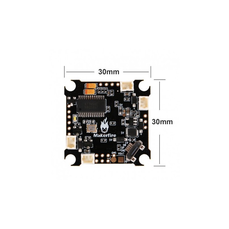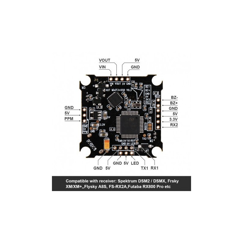 Mini contrôleur de vol pour frame de drone tiny whoop. Compatible SBUS, IBUS, DSM. Le contrôleur de vol et l'OSD se configure sous Betaflight. Au format standard pour une frame de tiny whoop.