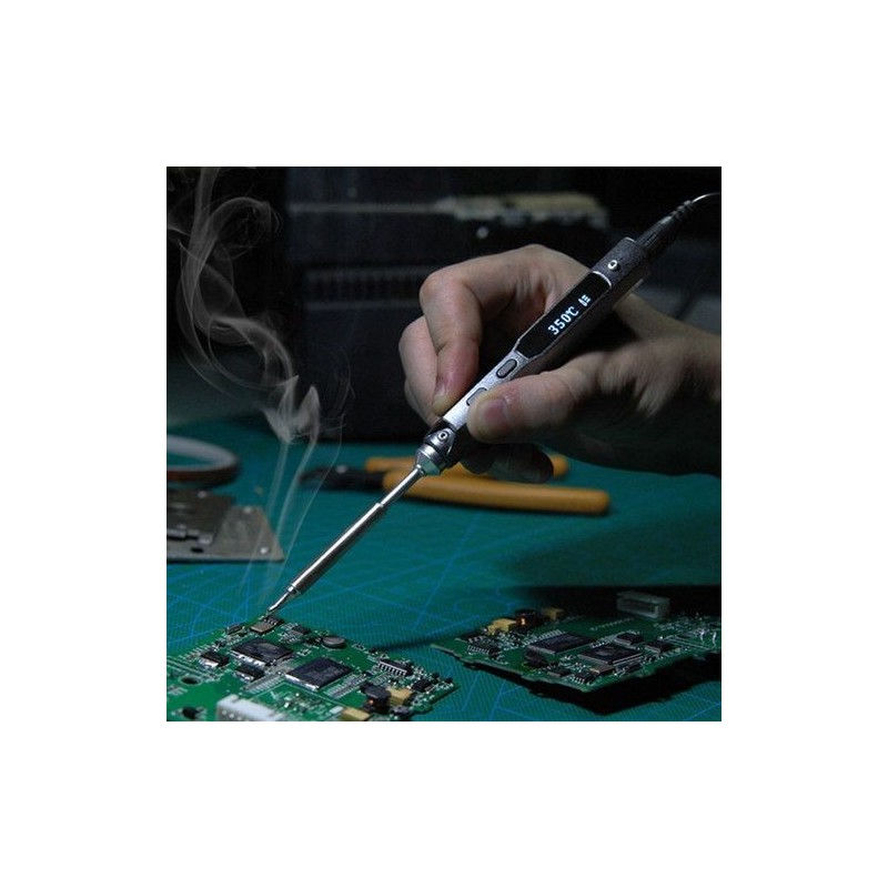 Mini fer à souder TS100 avec fonctions intelligentes. Contrôle de la température, mode arrêt automatique, configuration via USB. Prêt à souder en 11 secondes en 24V et en moins de 40 secondes en 12V. Livré avec le pad TS-B2 pour de fine soudures.