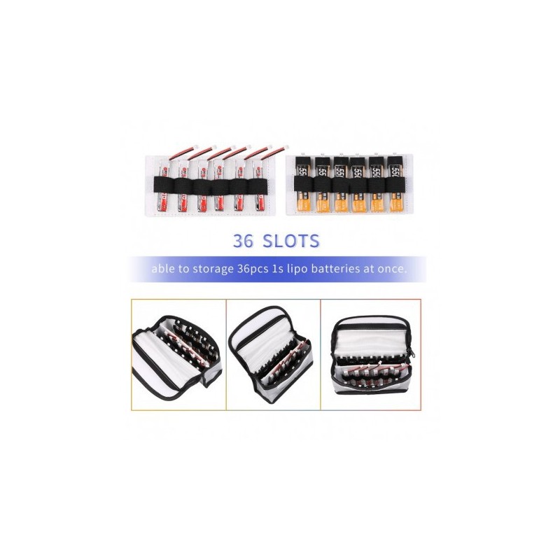 Pochette de sécurité anti-feu et anti-explosion pour le transport et le stockage de batteries Lipo. Capacité de 36 slots pour des batteries 1S ou pour plusieurs batteries 2S ou plus en enlevant la paroi.
